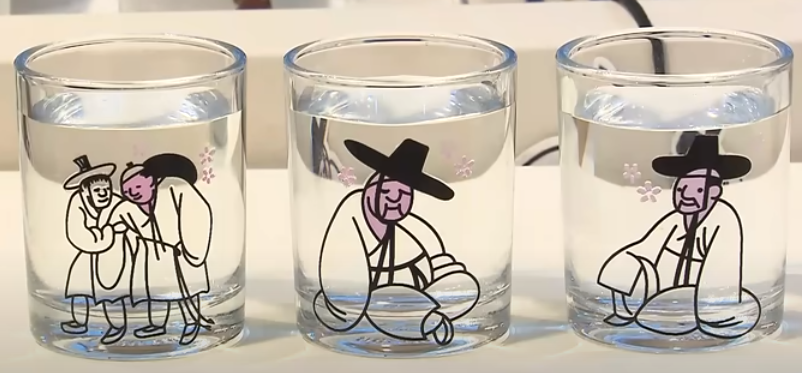 김홍도의 그림에 등장하는 인물들을 관찰하면서 차가운 물이나 음료가 닿으면 잔에 칠해진 염료의 색이 바뀌는 기술을 접목하여 이 제품을 선보였습니다.